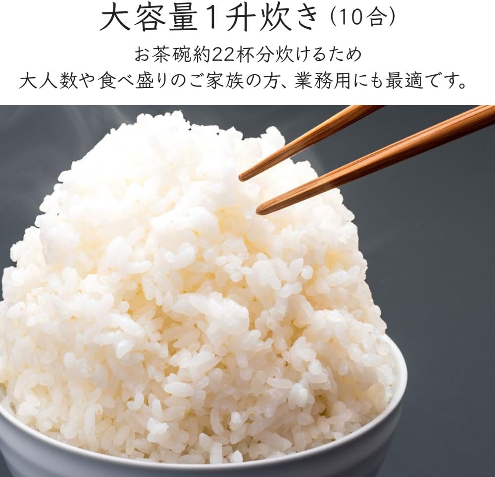 - ✓ 5人以上の大家族やまとめ炊き派(10合の大容量でデータベース平均5.5合の約1.8倍、一度に大量のご飯を炊飯可能)
