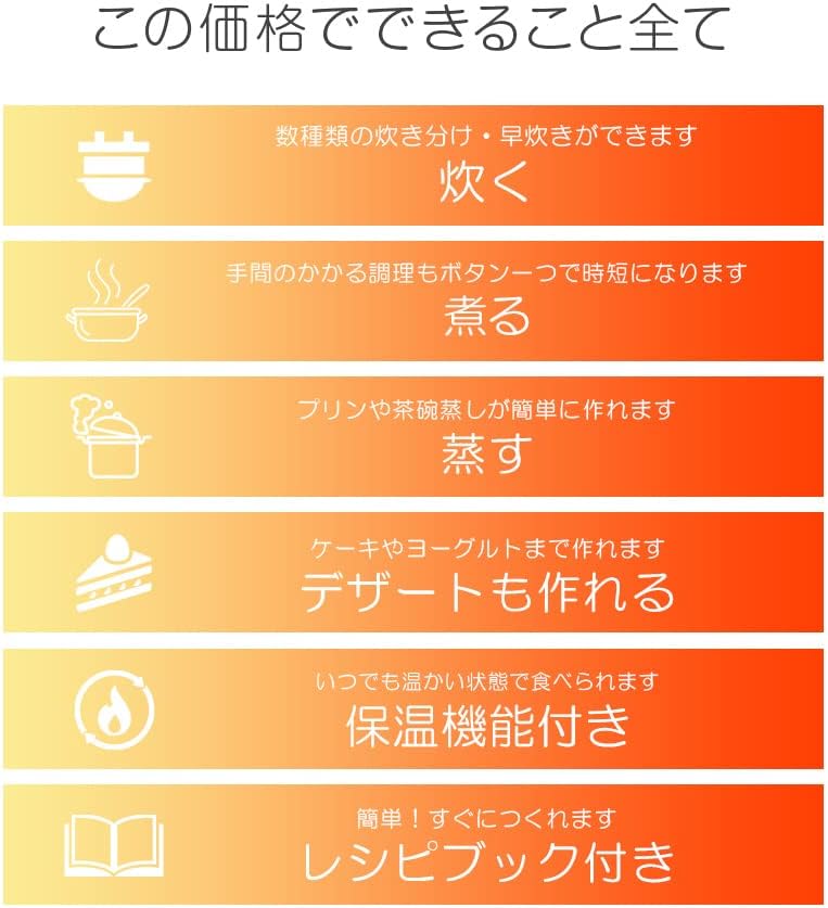 - ✕ パンやケーキなど多彩な調理メニューを使いたい方(白米・玄米・おかゆの3モードに限定される)