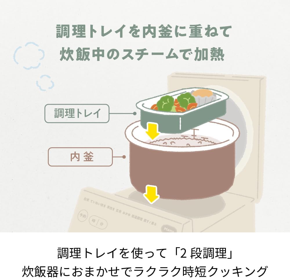 調理トレイを使えば炊飯と同時におかず2品まで調理可能。忙しい日もごはん+おかずが一台で完成し、洗い物も減らせる