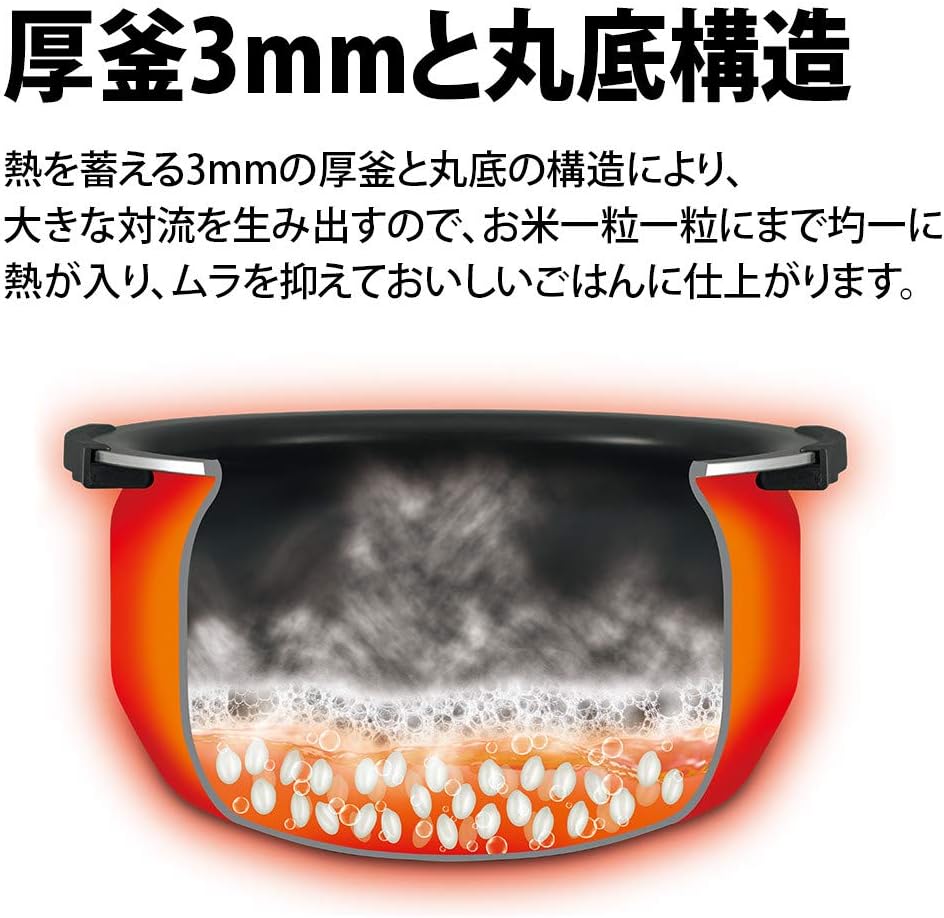 IH式の「匠の火加減」技術と3mm厚の丸底構造内釜により、対流を活かしたムラの少ない炊き上がりが特徴です。ただし圧力IHのようなもちもち感は控えめで、あっさりめの仕上がりを好む方に向いています。お客様の評価では炊き上がりについて意見が分かれています。