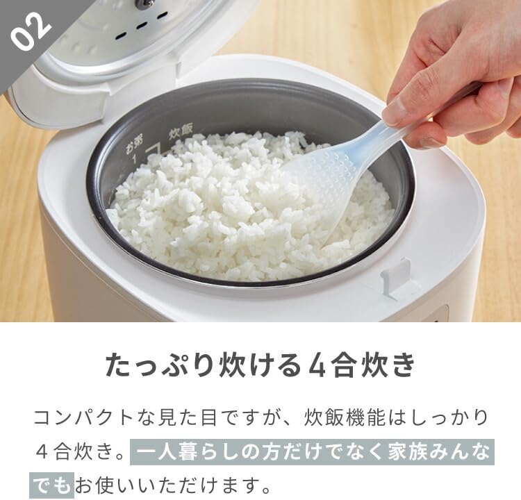 - ✓ 一人暮らしや二人暮らしで少量炊きしたい方(4合炊きで2合からの少量炊飯に対応し、205×200×195mmの省スペース設計)