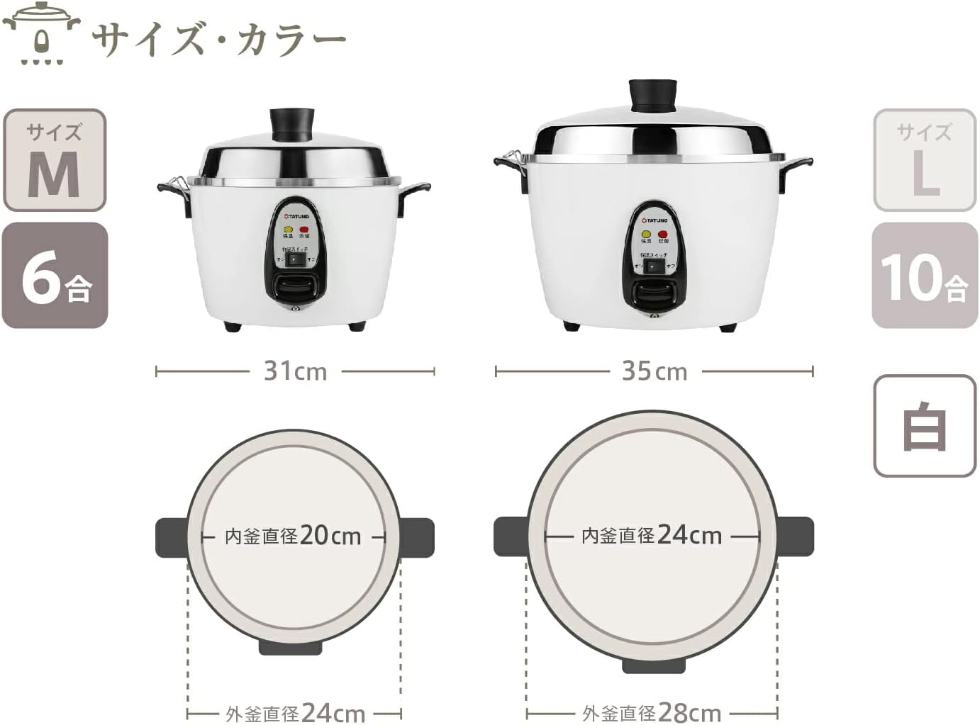 TAC-06IDは「Mサイズ」として販売されており、約6合(1.08リットル)前後の炊飯容量に対応するモデルです。一人暮らしから2〜3人世帯に適したサイズで、本体寸法は310×255×240mmとコンパクトな設計になっています。正確な炊飯容量は販売ページの仕様欄でご確認ください。