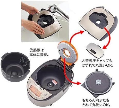 着脱式の内ぶたは工具不要で簡単に取り外して丸洗いでき、圧力IHモデルと比べてパッキンや圧力弁がないため洗浄パーツが大幅に少ない。実際のユーザーからも「外蓋を外して洗える点が便利」「圧力IHより洗うのも簡単」と清掃性が高く評価されている。蒸気に関しては蒸気レス・蒸気カット機能は非搭載のため、設置場所の上部スペースに注意が必要。