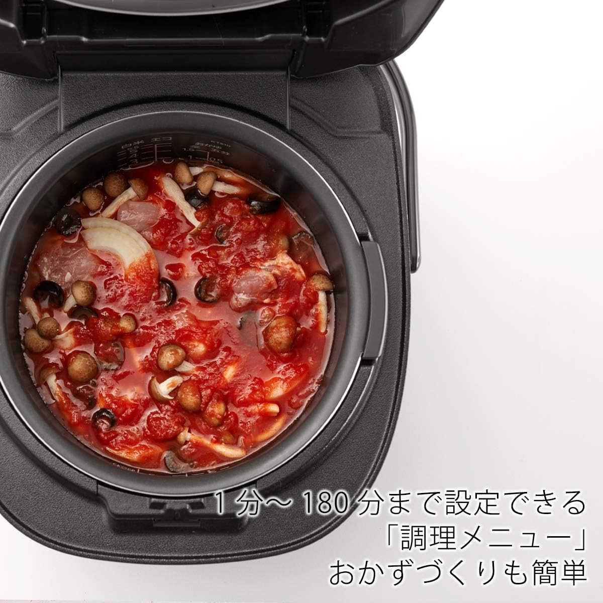 白米・早炊きの基本メニューに加え、スロークック・パン・ケーキの調理メニューを搭載し、計5種類のモードに対応しています。スロークックではスープや煮込み料理の素材をじっくり加熱でき、パン・ケーキモードでは計量カップと付属レシピで手軽にホームベーキングが楽しめます。ただし、玄米・おかゆ・炊き込みご飯などの専用メニューは非搭載のため、メニューの多様性ではやや限定的です。