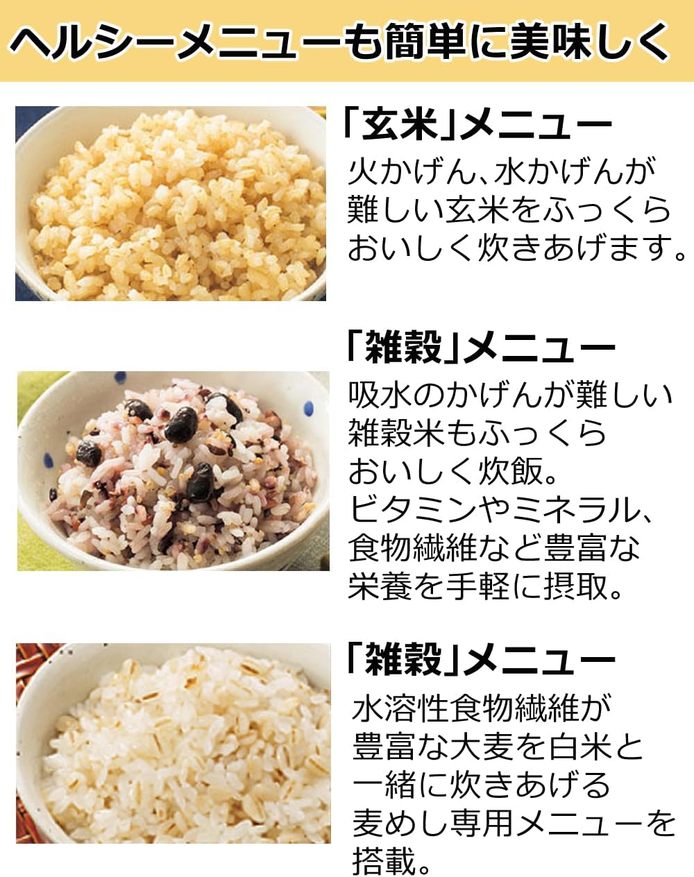 - ✕ 玄米・雑穀米・おかゆなど多彩な炊飯メニューを使いたい健康志向の方(対応モードが限定的)