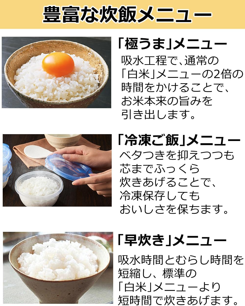 炊飯メニューは白米が中心で、玄米・おかゆ・早炊きなど多彩なモードを求める方には物足りない