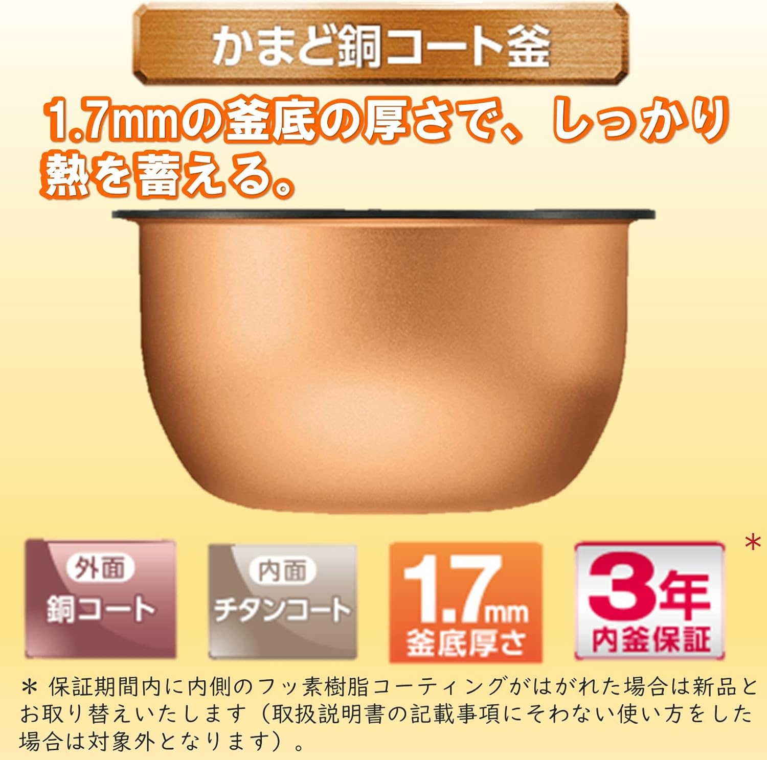 内釜には銅素材を活かしたかまど銅コート釜を採用しています。銅は鉄やステンレスよりも熱伝導率が高く、釜全体にすばやく均一に熱が伝わるため、炊きムラを抑えた仕上がりが期待できます。データベース平均の5層構造と比較した詳細な層数は非公開ですが、銅コーティングによる熱効率の良さが本機の特徴です。