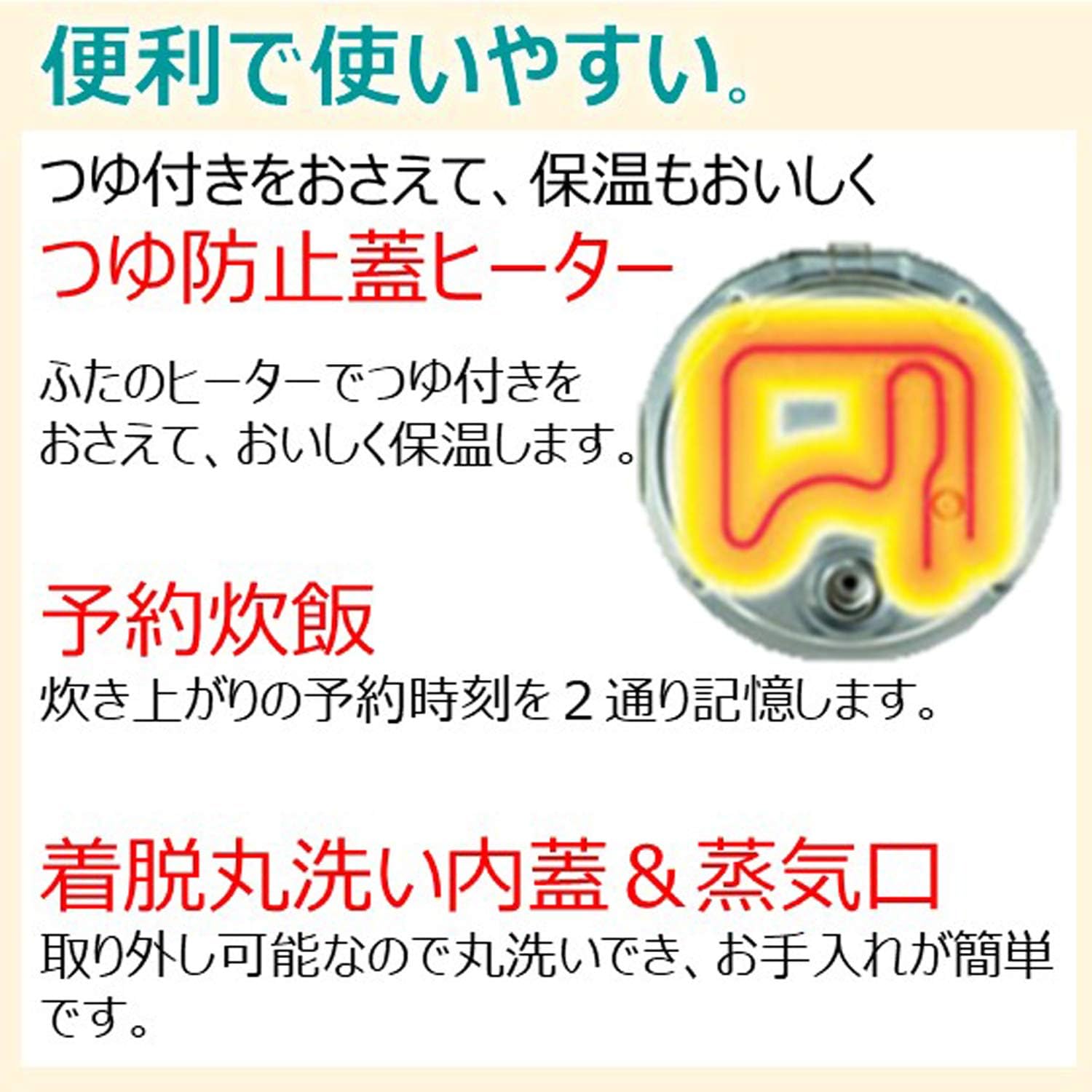 着脱式蓋採用で内ぶたを取り外して丸洗いでき、蒸気口まわりの清掃も簡単