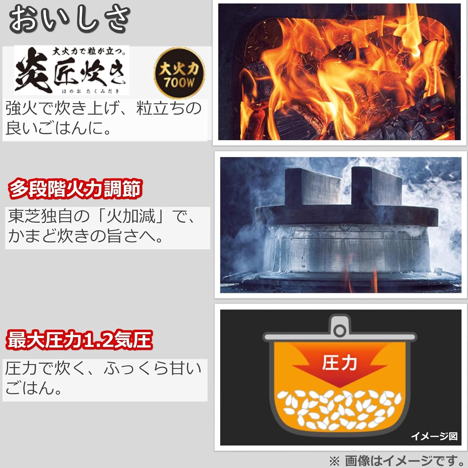 東芝独自の内釜を採用し、圧力IHの高温加熱に対応した構造で熱伝導率を高めています。内釜の層数や厚さの詳細公開情報は限られていますが、データベース平均5層と比較すると小容量モデルとして十分な蓄熱性を確保した設計です。釜の取り扱いやすさも顧客から評価されており、コンパクトサイズならではの軽量さが日常使いの利便性を高めています。