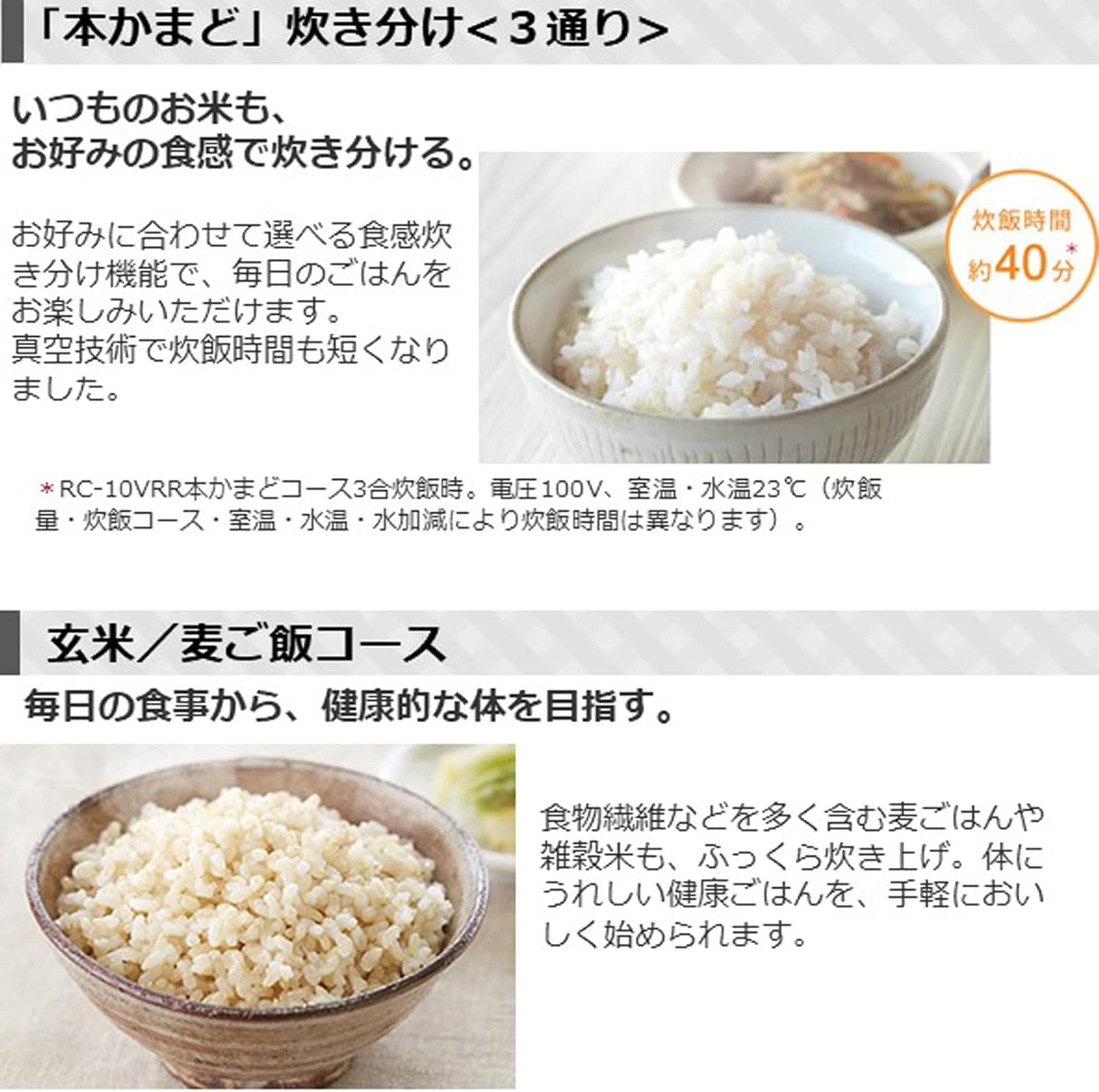 玄米・おかゆ・早炊きなどの炊飯メニューが確認できず、白米以外の炊き分けが限定的。健康志向や時短ニーズには不向き
