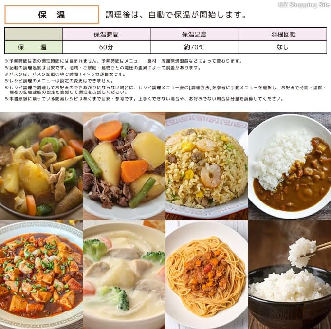 玄米モード・おかゆモード・早炊きモードが非搭載のため、炊飯器としての調理メニューのバリエーションはデータベース内の専用炊飯器と比べて限定的