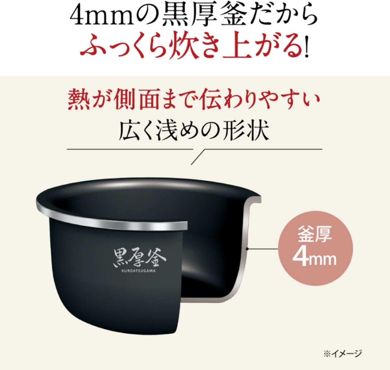 内釜の厚さは4mmで、データベース平均の5層構造と比較するとシンプルな構成です。多層構造のIH式内釜(タイガーの本土鍋や象印上位モデルの鉄器コート豪炎かまど釜など)と比べると蓄熱性は控えめですが、その分軽量で洗いやすいという利点があります。マイコン式の炊き方に最適化された設計で、日常使いには十分な耐久性を確保しています。