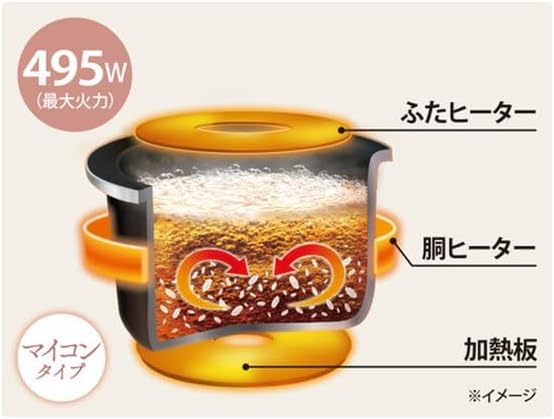 NL-BF05-BZはマイコン式の加熱方式を採用しており、底面ヒーターによる加熱で最大電力495Wの仕様です。IH式のような釜全体を包み込む加熱や、圧力IH式(データベース平均1.05気圧)のような高圧炊飯には非対応ですが、マイコン制御により温度管理を最適化し、3合の少量炊飯ではふっくら炊きを実現します。ハイパワーモデルと比較すると加熱力は控えめですが、その分消費電力を大幅に抑えられる点がメリットです。
