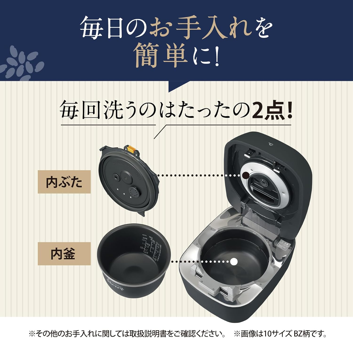 お手入れ点数2点と業界最少クラスで、内ぶたの分解洗浄の手間が大幅に軽減されている