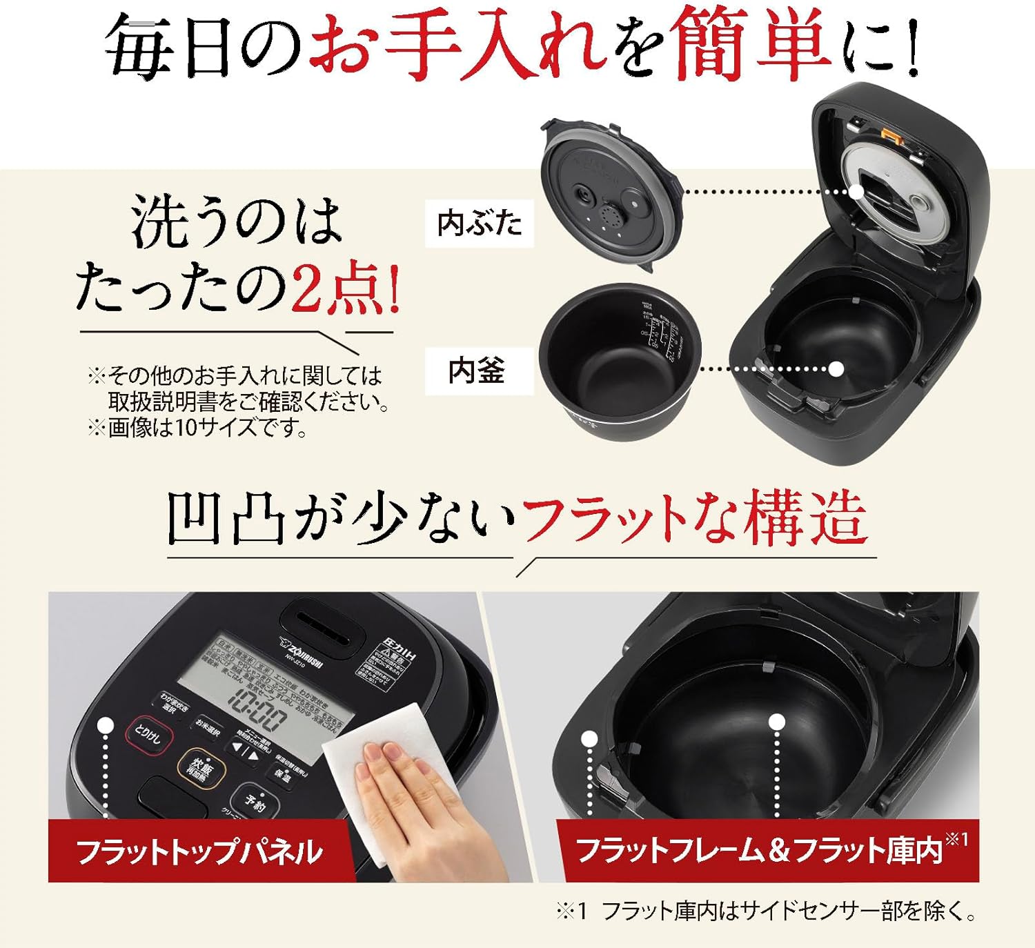 象印の炊飯器は内ぶたが取り外し可能で丸洗いできる設計が一般的で、日常のお手入れは比較的簡単です。操作パネルはシンプルな構成で、複雑な設定なしに使い始められます。蒸気カット機能の有無については仕様で明記されていないため、設置場所の換気を考慮してください。