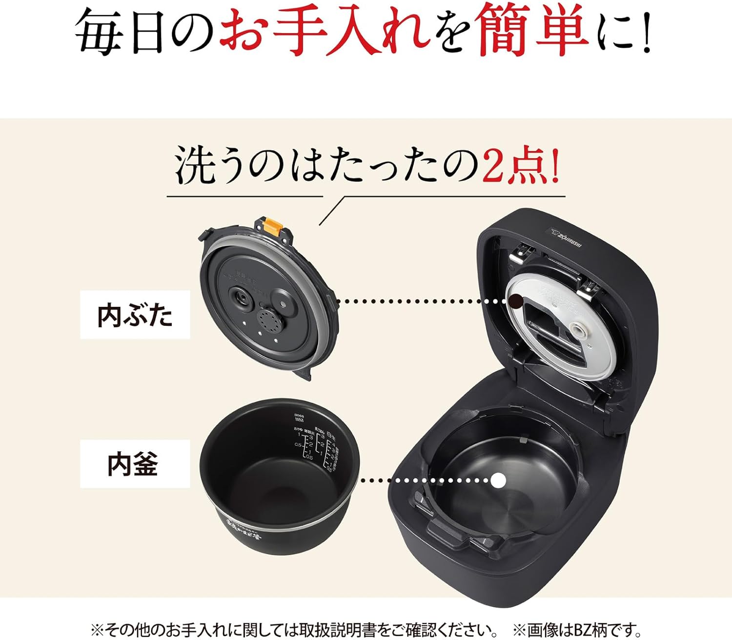 お手入れ点数はわずか2点で、内ぶたと内釜を洗うだけの簡単メンテナンス。毎日使う炊飯器だからこそ、この手軽さは大きなメリット。本体は日本製で、230×305×205mmのコンパクト設計のため出し入れや設置場所の移動も容易。