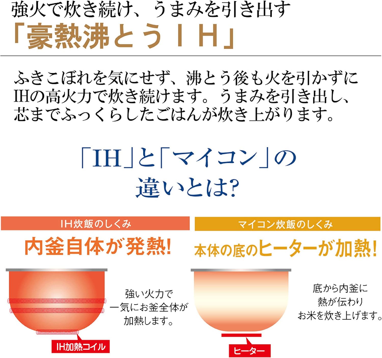 豪熱沸とうIH加熱でムラなく強火炊飯し、ふっくら粒立ちの良い白米に仕上がる